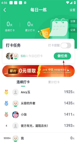 3、进入每日一练页面后,可查看打卡数据及排名情况,点击做任务按钮,即可进入具体的题目作答界面。
