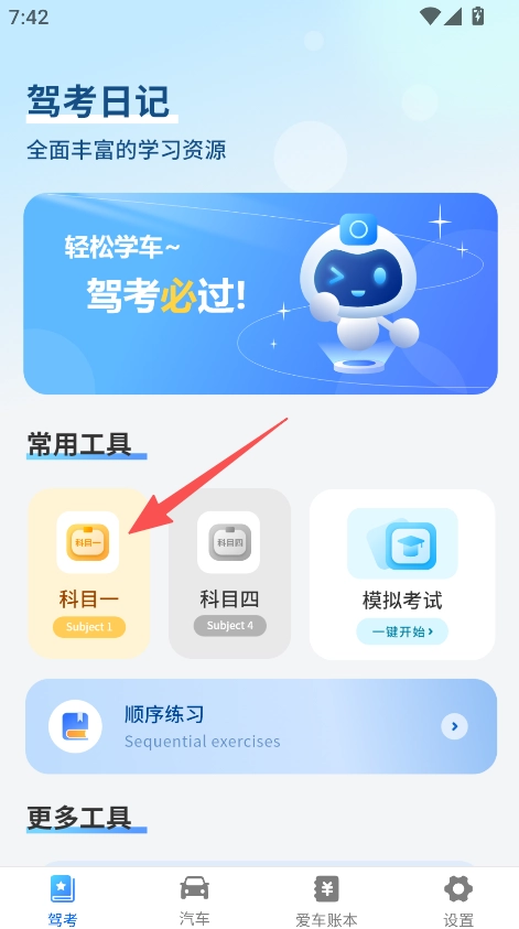 1、具备科目学习功能,点击常用工具中的科目一选项,即可进入该科目进行练习。