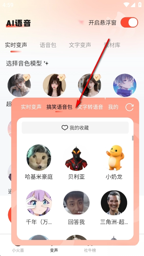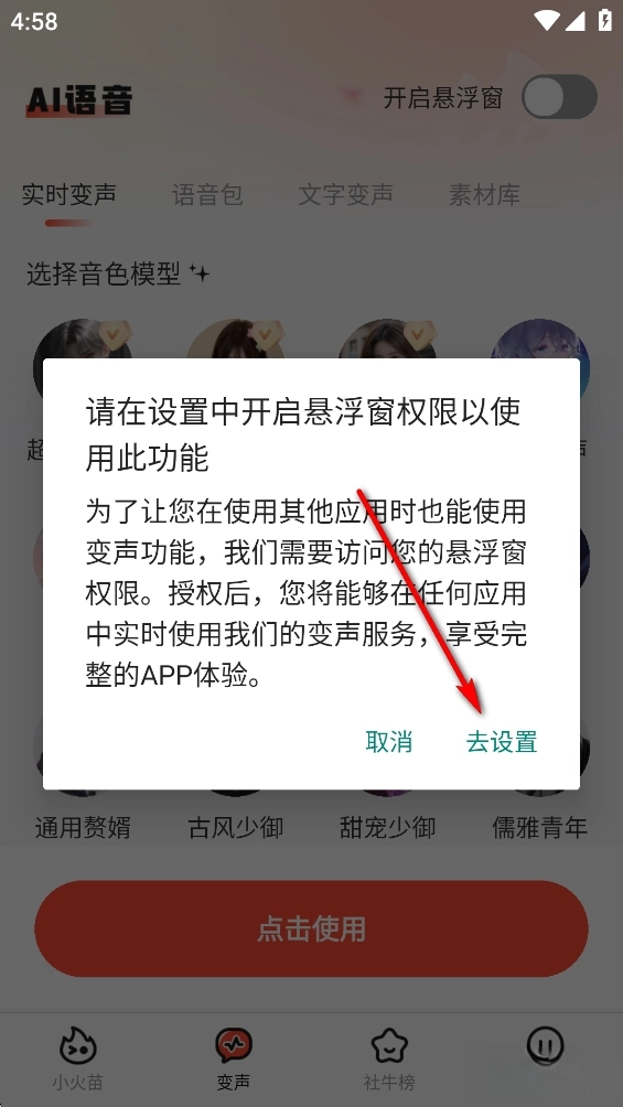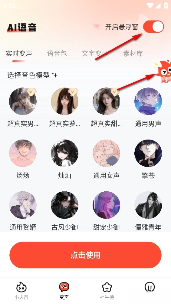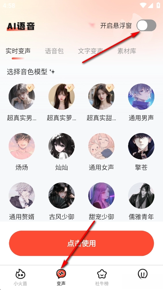 点击【变声】,再点击右上角开启悬浮窗的开关