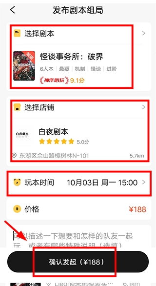 4、选定剧本、店铺以及时间后,点击【确认发起】就可以了。