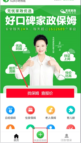 1、打开无忧家政后,点击“找保姆 查报价”或者页面下方的“快速找保姆”选项;