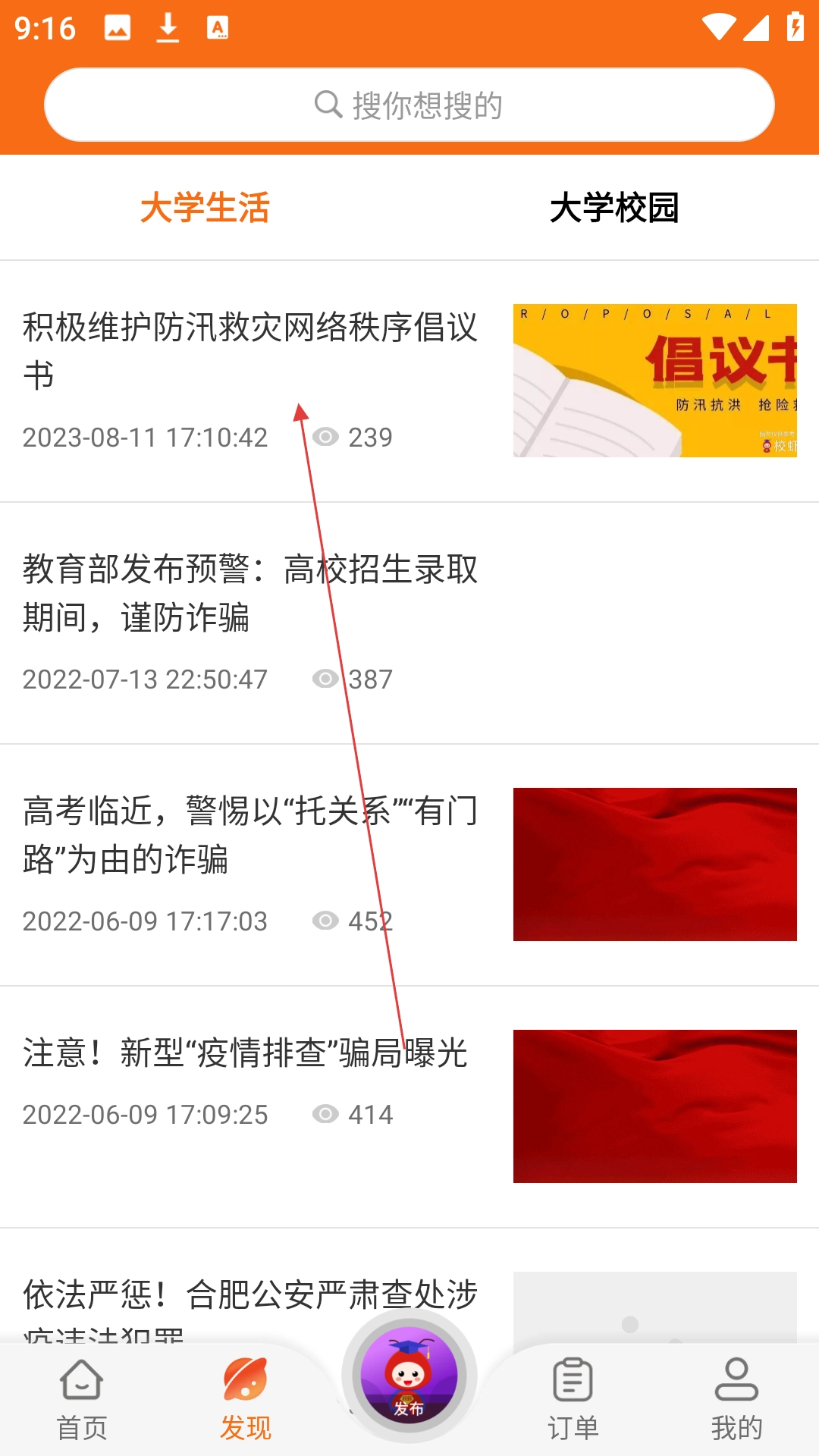 3、于发现页面,点击感兴趣的【文章】,从而进入文章详情页面。