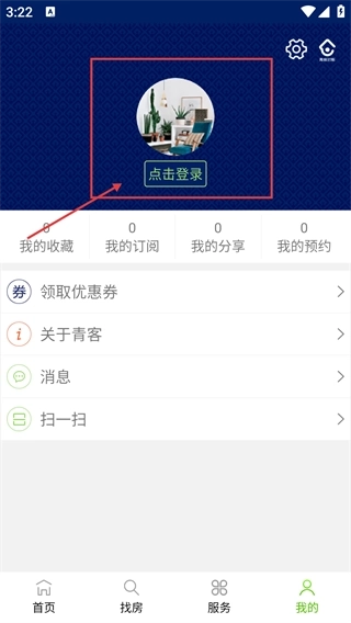 2、进入【我的】界面后,找到头像旁边的【点击登录】按钮并点击,之后就能使用【我的收藏】等个人功能了。