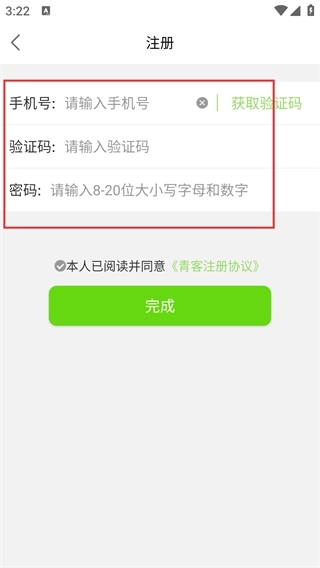 4、进入注册界面后,依次填写【请输入手机号】【验证码】【密码】这三项内容,勾选【青客注册协议】,最后点击【完成】按钮,即可完成注册流程。