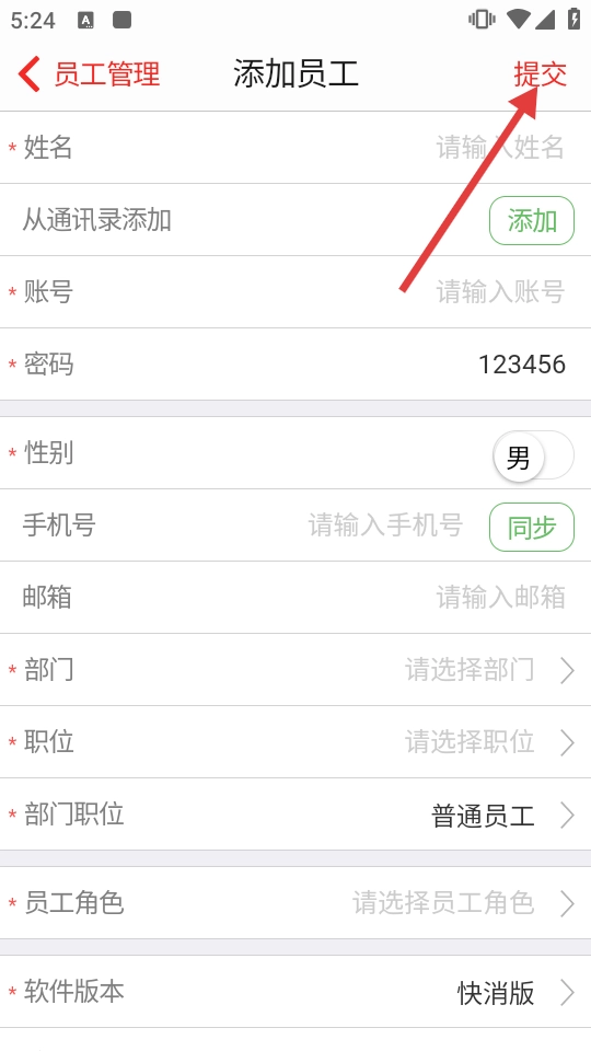 4、于添加员工页面,填写员工信息后点击【提交】,即可完成员工添加操作。