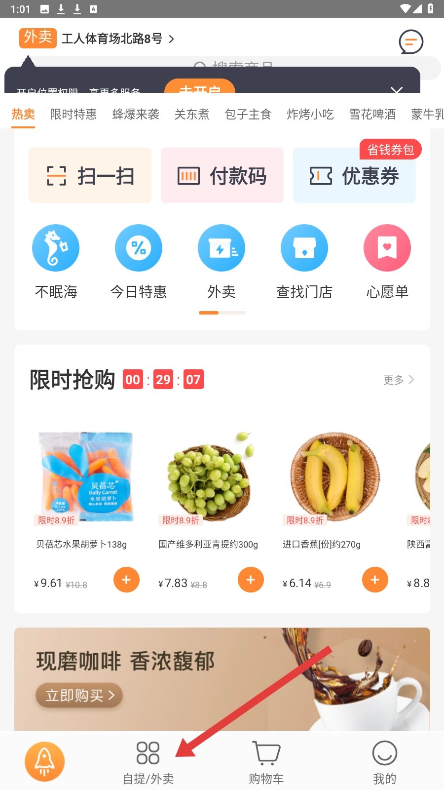 1. 点击【自提/外卖】选项,进入商品分类页面,依据自身需求选择零食、饮品等各类商品类别。