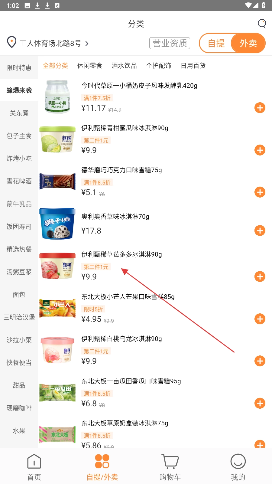 2. 挑选像【伊利甄稀草莓多多冰淇淋】这样的商品,查看价格优惠情况,然后进入购买页面。