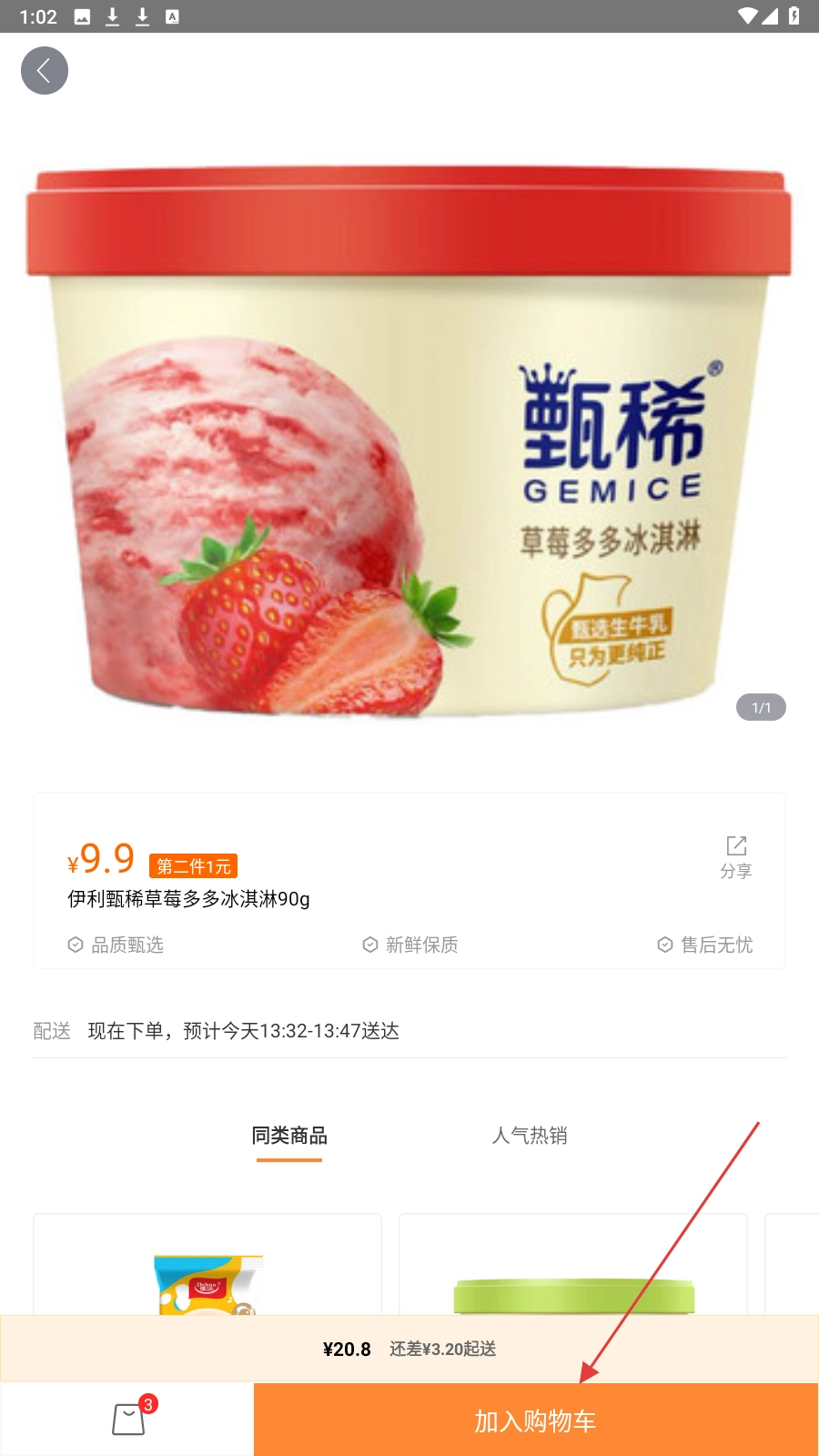 3、点击【加入购物车】按钮,把【伊利甄稀草莓多多冰淇淋】添加至购物车。