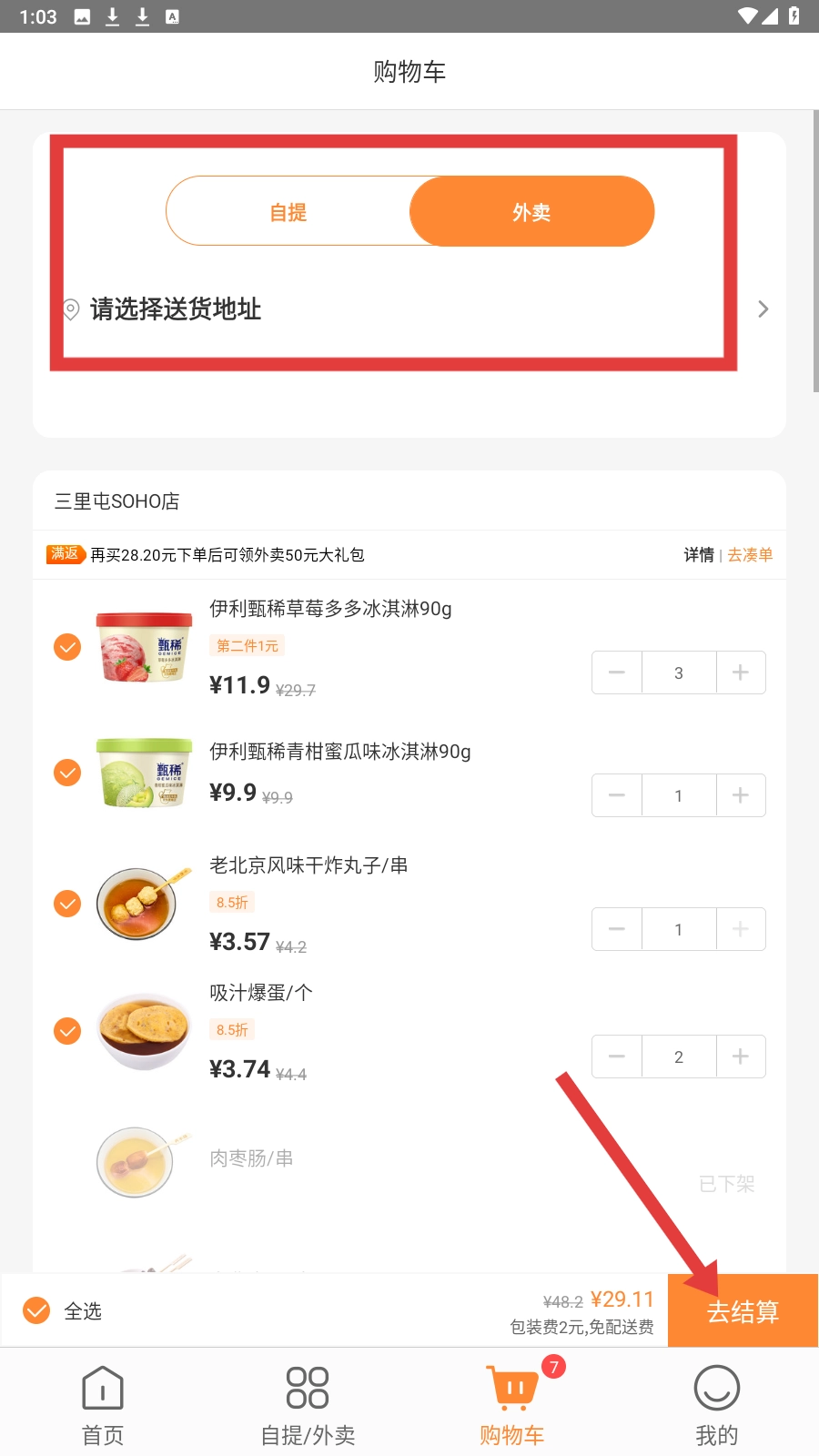 4、选择【外卖】选项,填写收货地址,点击【去结算】,完成购物车商品的结算,从而完成下单操作。