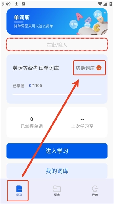 1.在【学习】专题点击“切换词库”可更改词库类型