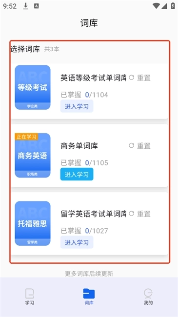 2.挑选想要学习的单词库,点击“进入学习”按钮就能切换词库啦。