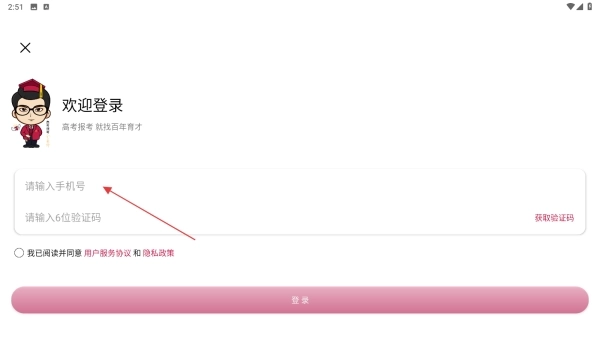 1.启动百年育才AI志愿填报应用程序,在登录页面填写手机号码与验证码,确认同意相关协议后,点击【登录】按钮完成登录操作。
