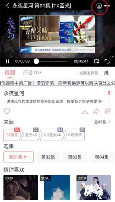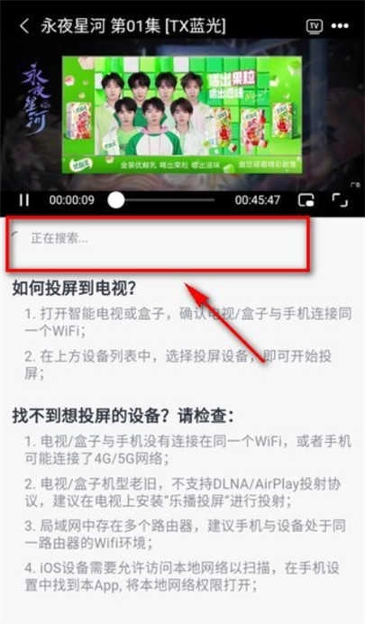 在播放页面的右上角,找到并点击【TV】图标,此时系统会自动搜索可用设备,请耐心等待一会儿,直到电视设备出现在搜索结果中。