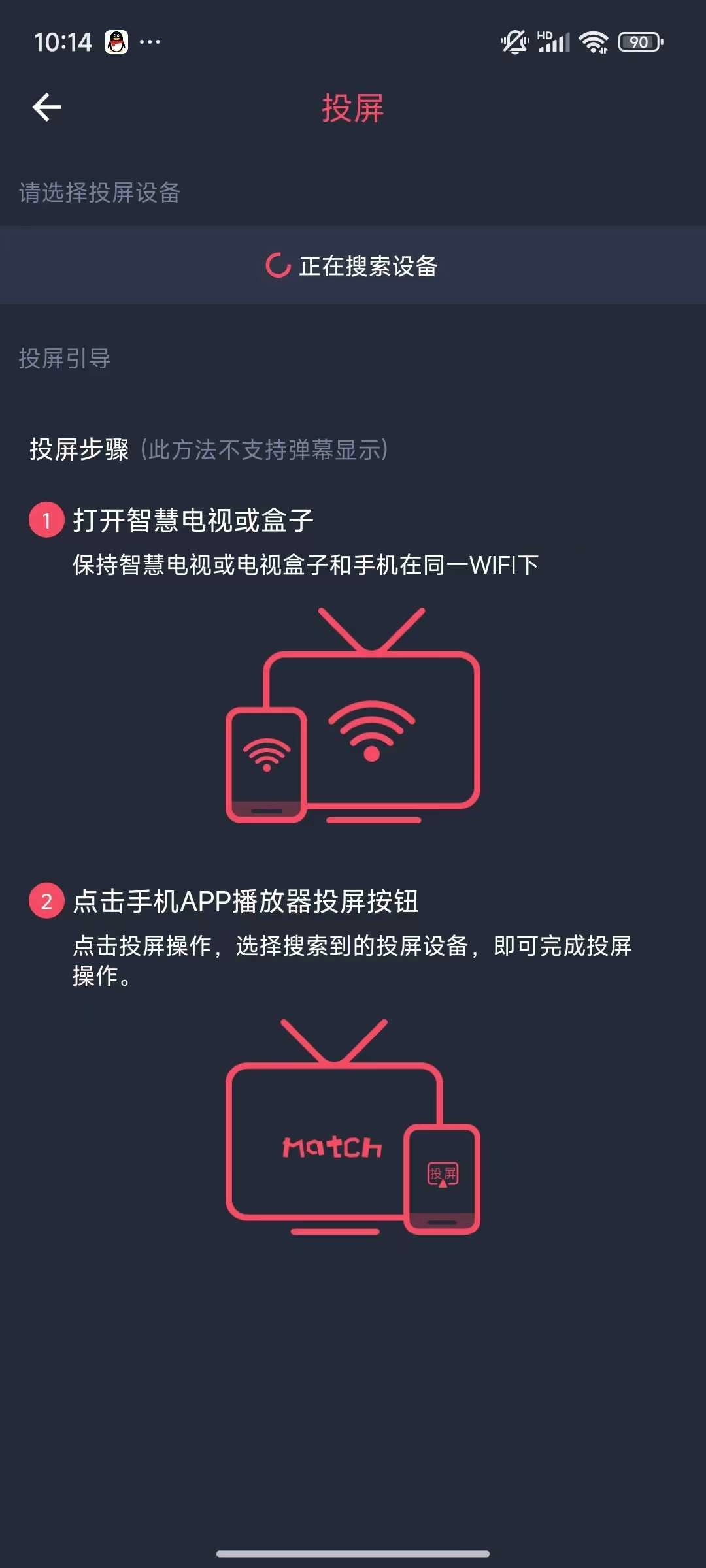 请确保电视或其他投屏设备和手机连接着同一个Wi-Fi网络。