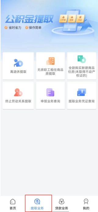 成功登录后,点击下方导航栏的【提取业务】选项,页面会显示离退休提取、无房职工租住商品房提取、全款购房提取、终止劳动关系提取等多种业务类型,用户可依据自身实际情况选择对应的提取方式。