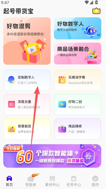 起号带货宝是专为短视频带货创作者量身打造的智能创作平台,它将传统带货内容制作从"耗时耗力"升级为"一键高效"的智能体验。通过整合海量带货素材、智能混剪技术和数字人带货功能,起号带货宝让每一份内容都充满商业价值,真正实现"内容创作零门槛,带货效果看得见"的智能带货新生态。