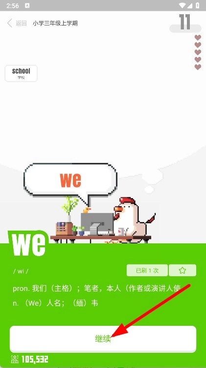 完成单词语义选择步骤后,可查看该单词的详细释义与用法示例,之后点击“继续”即可进入下一个单词的学习环节。