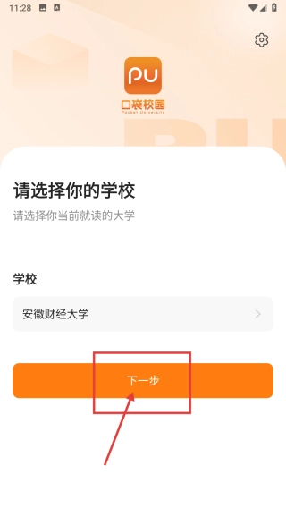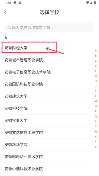 在学校列表选择页面,挑选安徽财经大学后,回到学校选择界面。