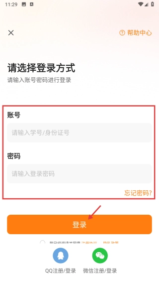 在登录方式选择页面,填写学号或身份证号以及密码后,点击登录按钮,即可完成账号登录流程。