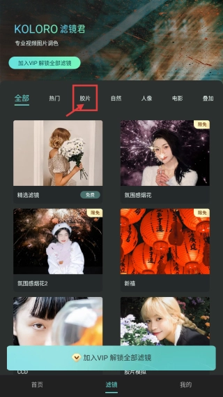 在滤镜选择页面,点击胶片分类,进入胶片滤镜列表页。