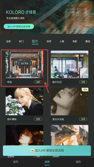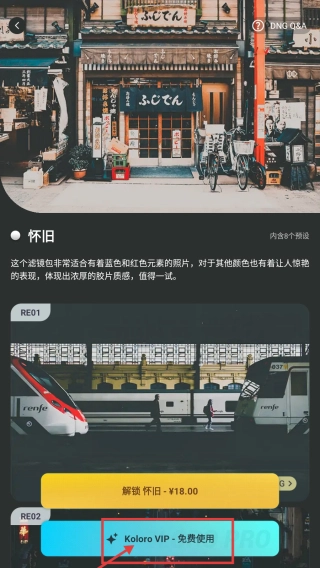 在滤镜详情页面,点击“Koloro-VIP-免费使用”按钮,即可应用这款怀旧滤镜。