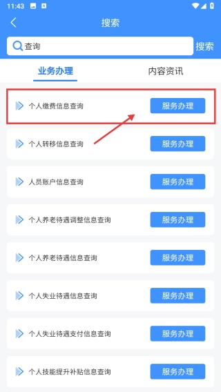 3、在查询结果页面,选择个人缴费信息查询条目,点击服务办理按钮,进行个人缴费信息的查询操作。