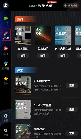 2. 在创作师界面,为用户配备了文本润色、公文助手、PPT大纲生成、朋友圈神器、小红书探店文案等功能。