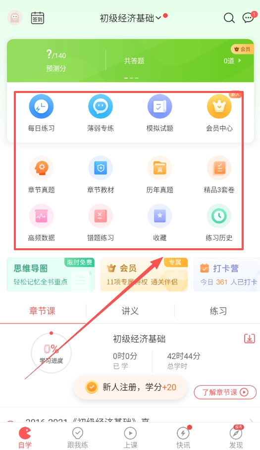 2、成功登录后,会进入学习主页。在此页面,有诸多学习模块可供挑选,像每日练习、薄弱专练以及章节真题等功能皆在其中。
