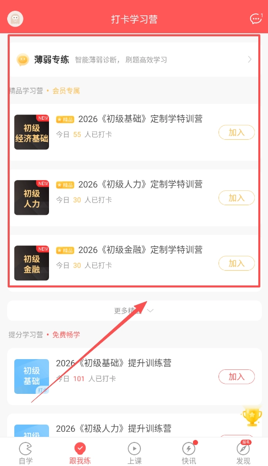 3、若希望进行有针对性的提升,可进入打卡学习营页面。该页面设有会员专属与免费畅学这两种类型,你可依据自己报考的科目,挑选相应的训练营。