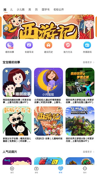 3、而在【听书】页面,我们还能收听到各种书籍的语音朗读,如睡前故事、名著导读、趣说历史等。