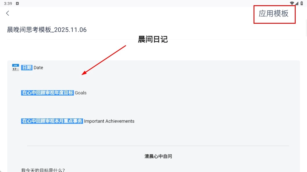 2、在模板库页面找到并点击【晨晚间思考模板-模板条目】,即可进入该模板的详情页面。