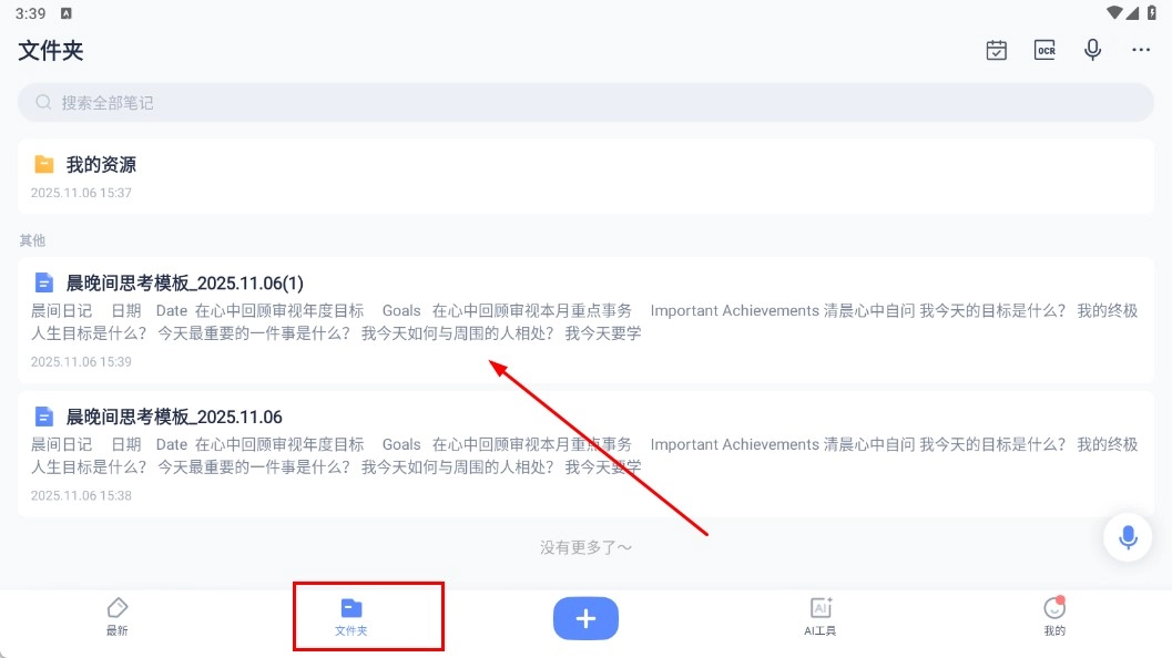 4、点击底部的【文件夹】功能按钮,就能查看应用模板后生成的笔记文件。