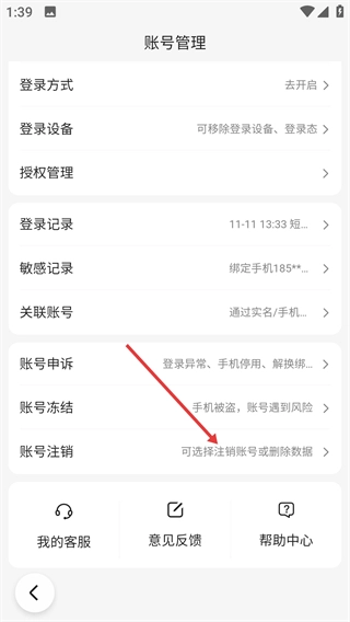 3、进入账号管理页面后,点击【账号注销】选项,即可跳转至账号注销页面。