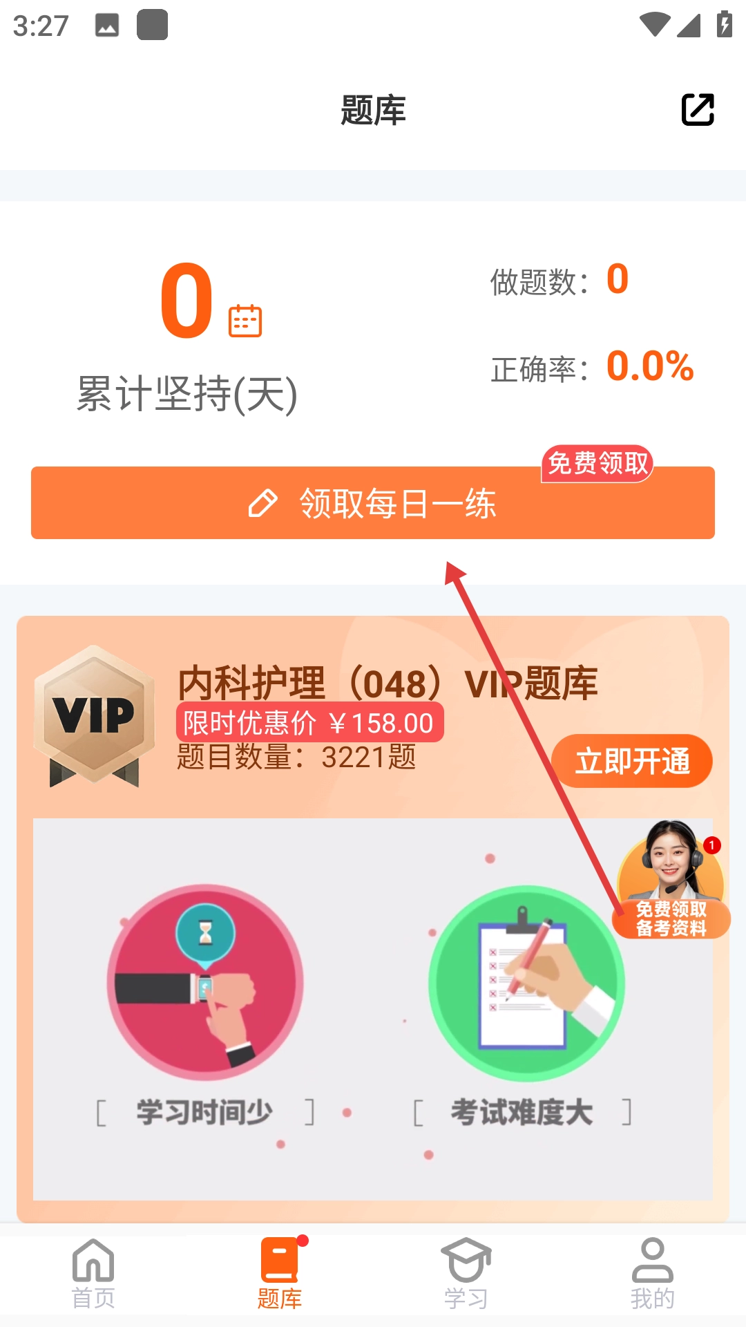 3、在题库页面点击【领取每日一练】,进入答题页面。