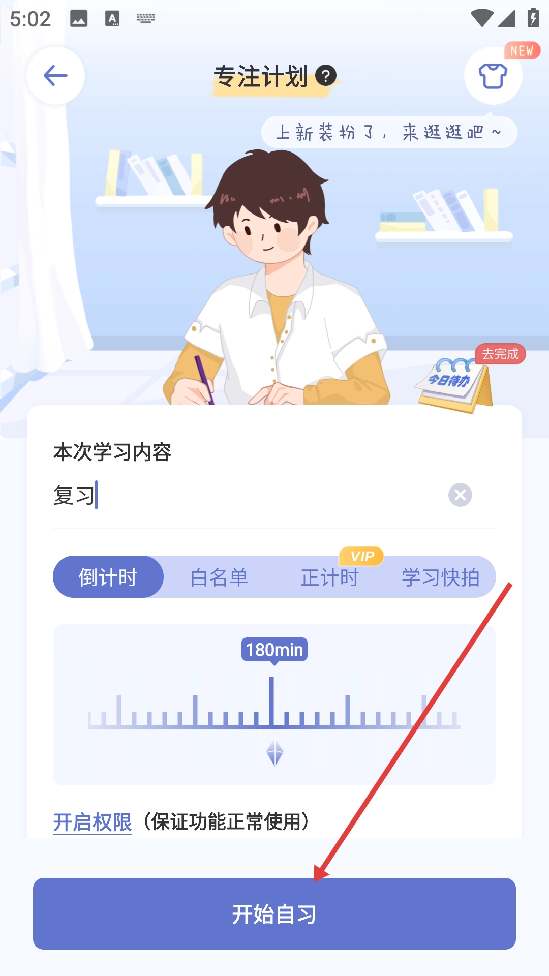 3、在专注计划页面填写学习内容(例如“复习”),然后点击【开始自习】按钮。