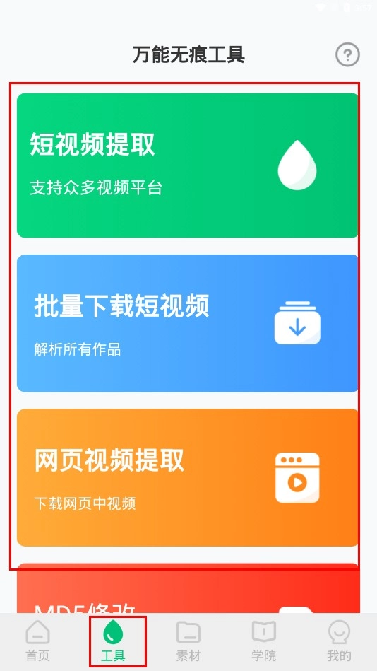 2、点击底部的【工具-功能按钮】,进入工具页面后,就能选择短视频提取、批量短视频等工具来使用。