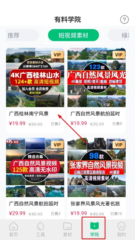 4、点击底部的【学院】功能按钮,进入学院页面后,就能查看各类短视频素材,其中包括广西桂林风景这类高清视频素材。