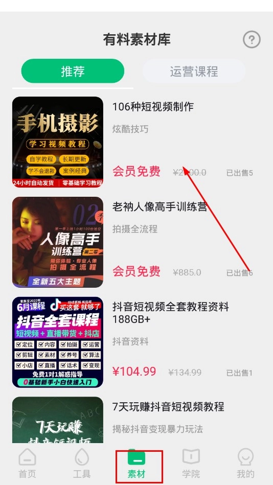 3、点击底部的【素材-功能按钮】,即可进入素材库页面,在该页面中能够查看系统推荐的各类素材内容,其中就包含短视频制作教程等。