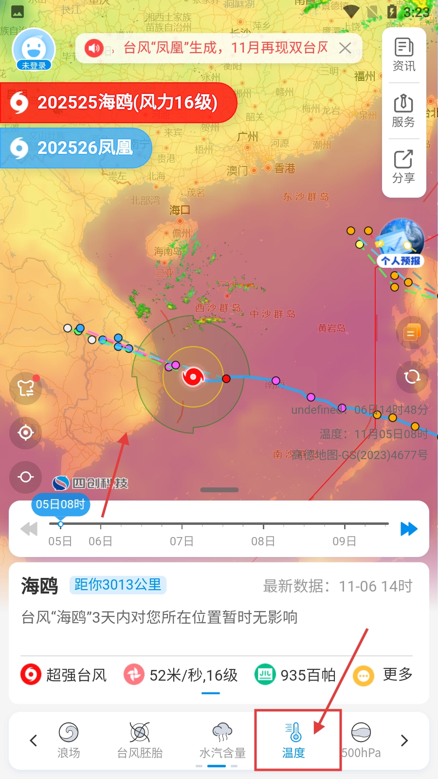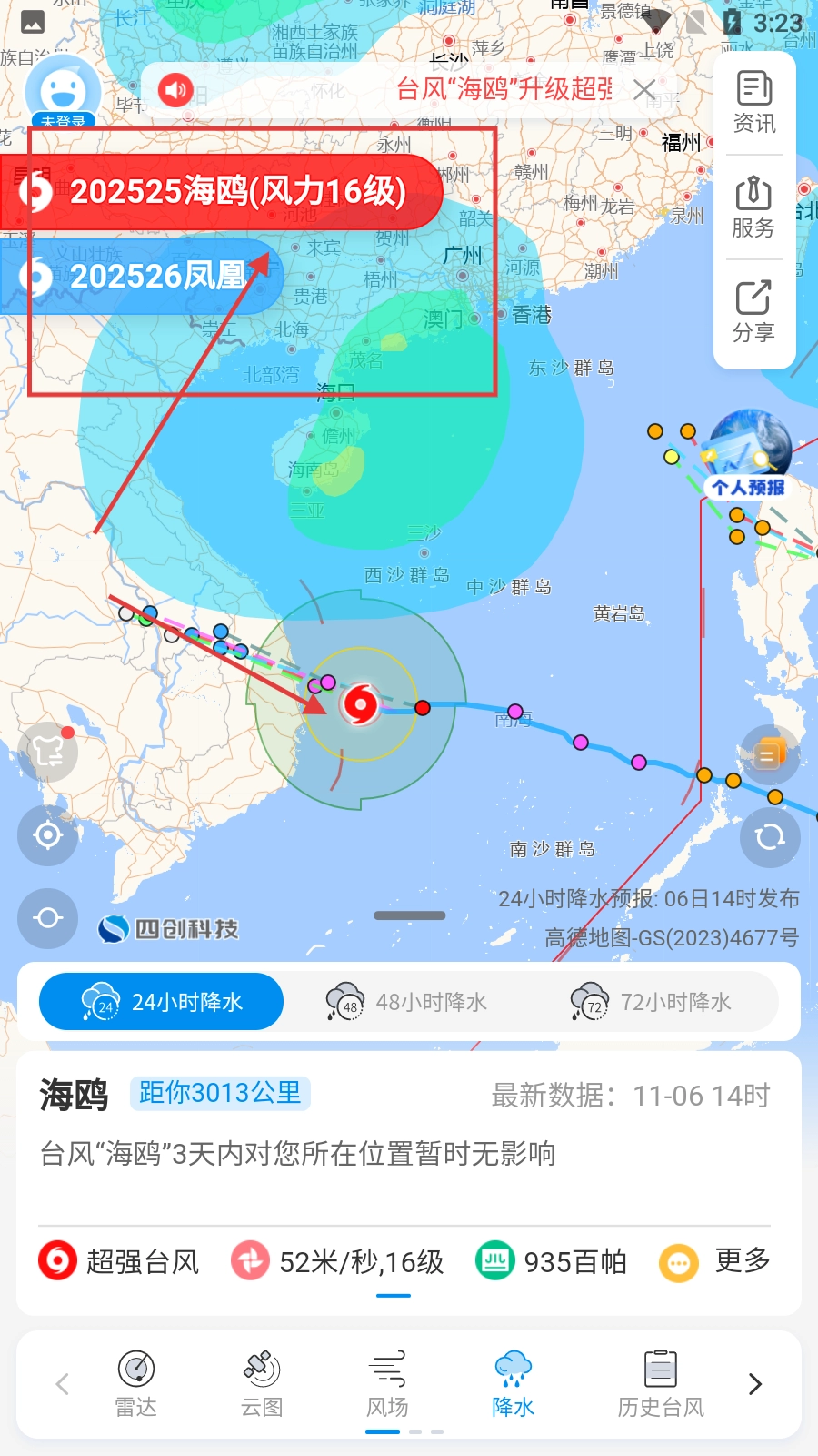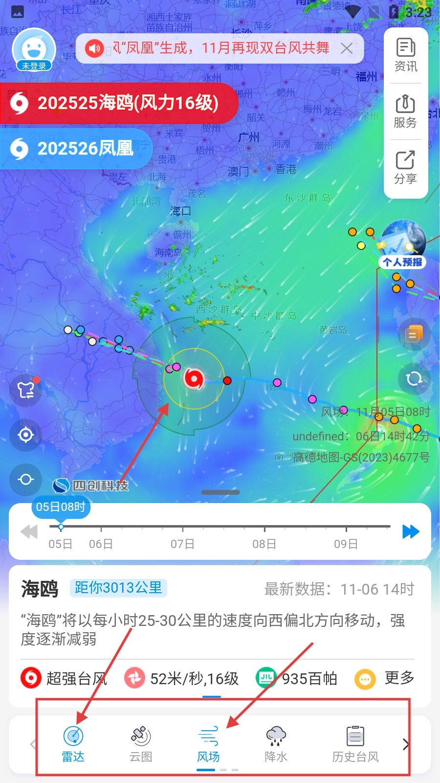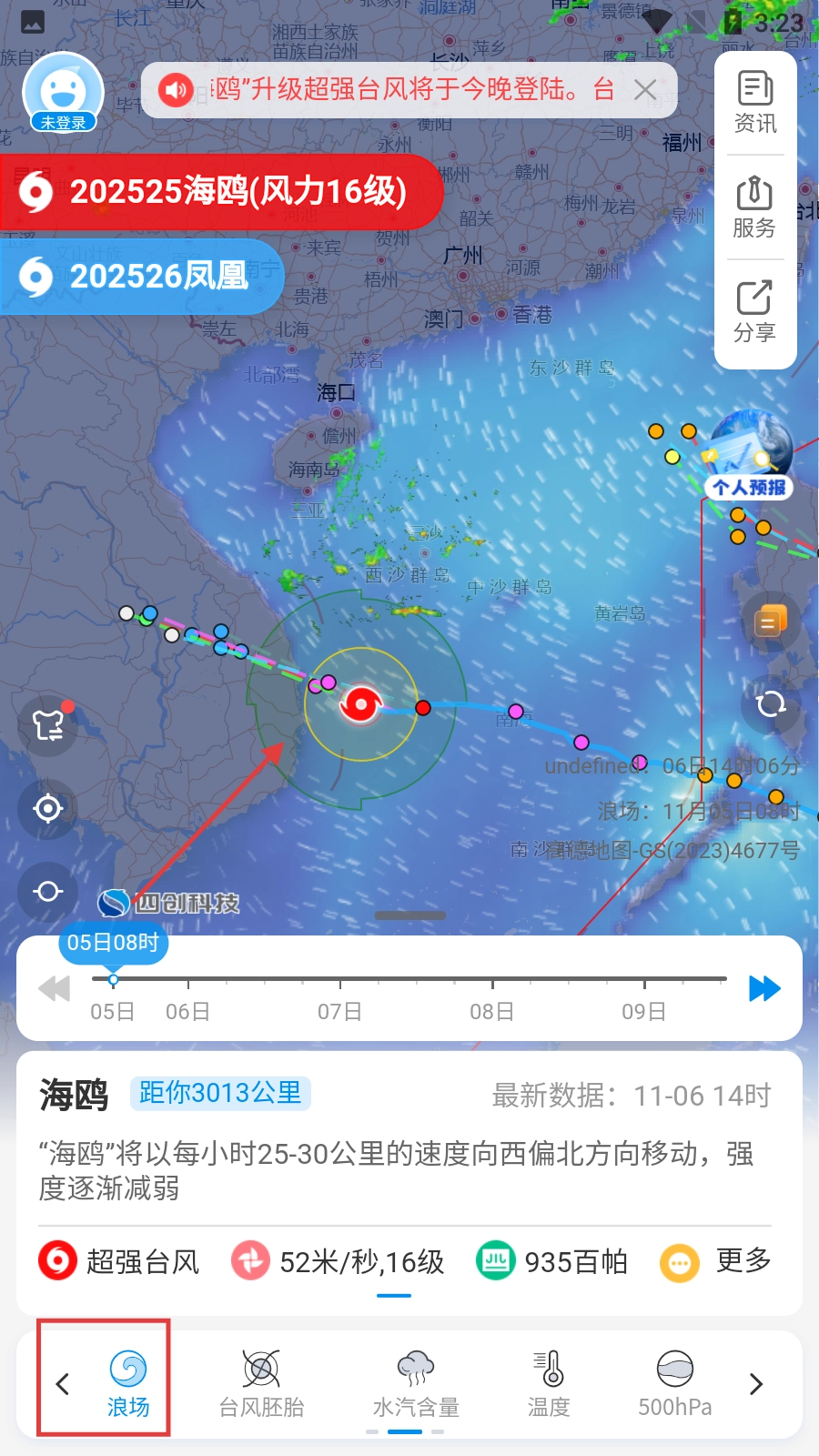 1、可查看台风【202525海鸥(风力16级)】和【202526凤凰】的分布,了解台风距离、强度及对所在位置的影响情况。