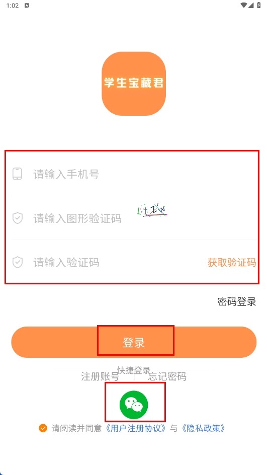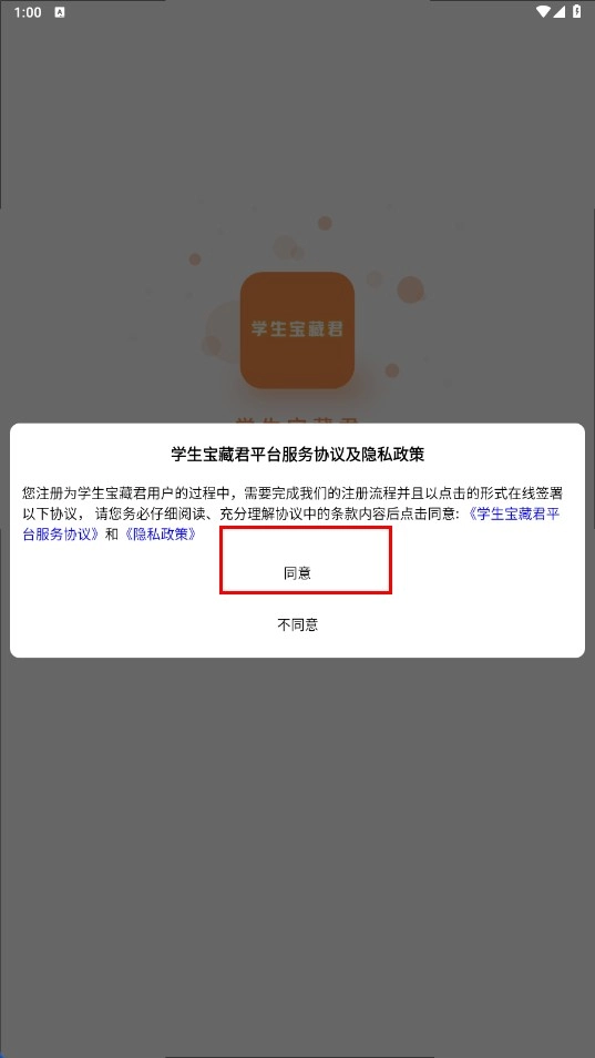 1、在学生宝藏君平台服务协议及隐私政策弹窗中,点击【同意-功能按钮】,进入登录页面。