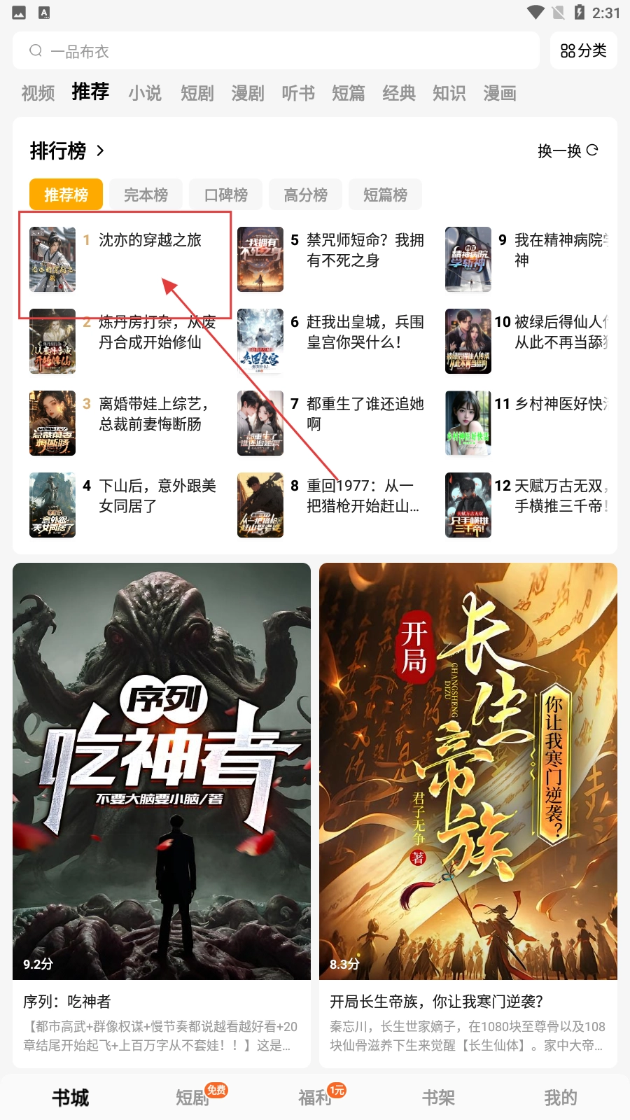 2、在书城排行榜,点击心仪小说,如《沈亦的穿越之旅》,进入小说详情页。