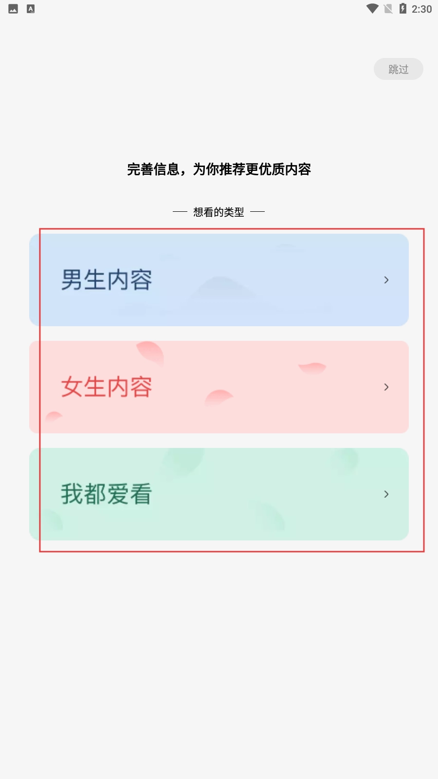 1、在内容类型选择页面,选择“男生内容”“女生内容”或“我都爱看”,完善信息以获取更优质内容推荐。