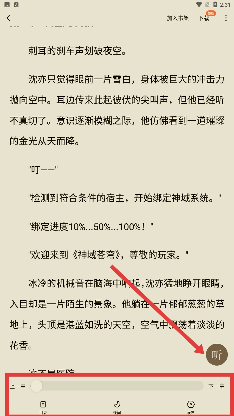 4、在阅读页面,可点击“听”按钮进行听书,也可通过底部功能键切换目录、设置夜间模式或进行其他设置。