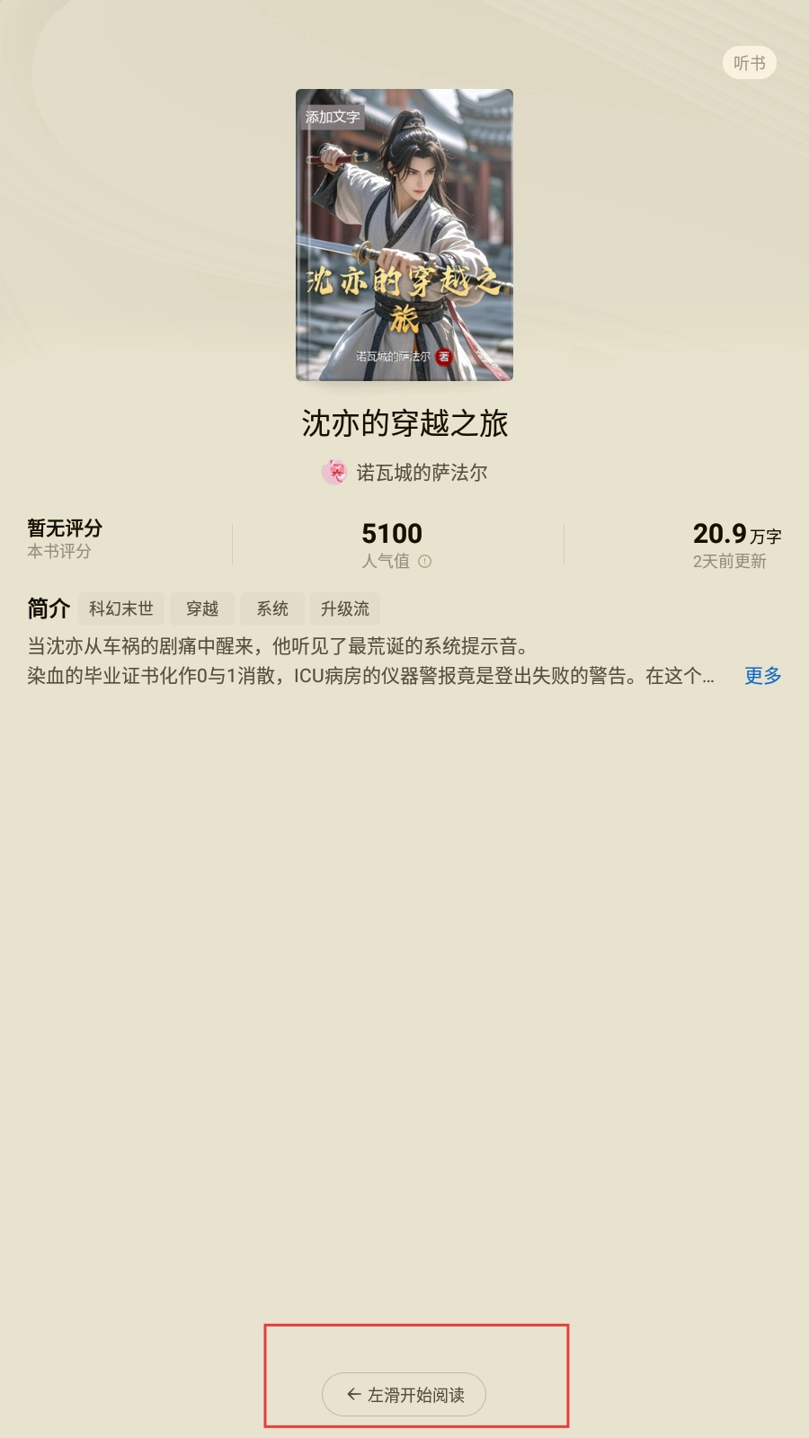 3、在《沈亦的穿越之旅》小说详情页,左滑开始阅读。