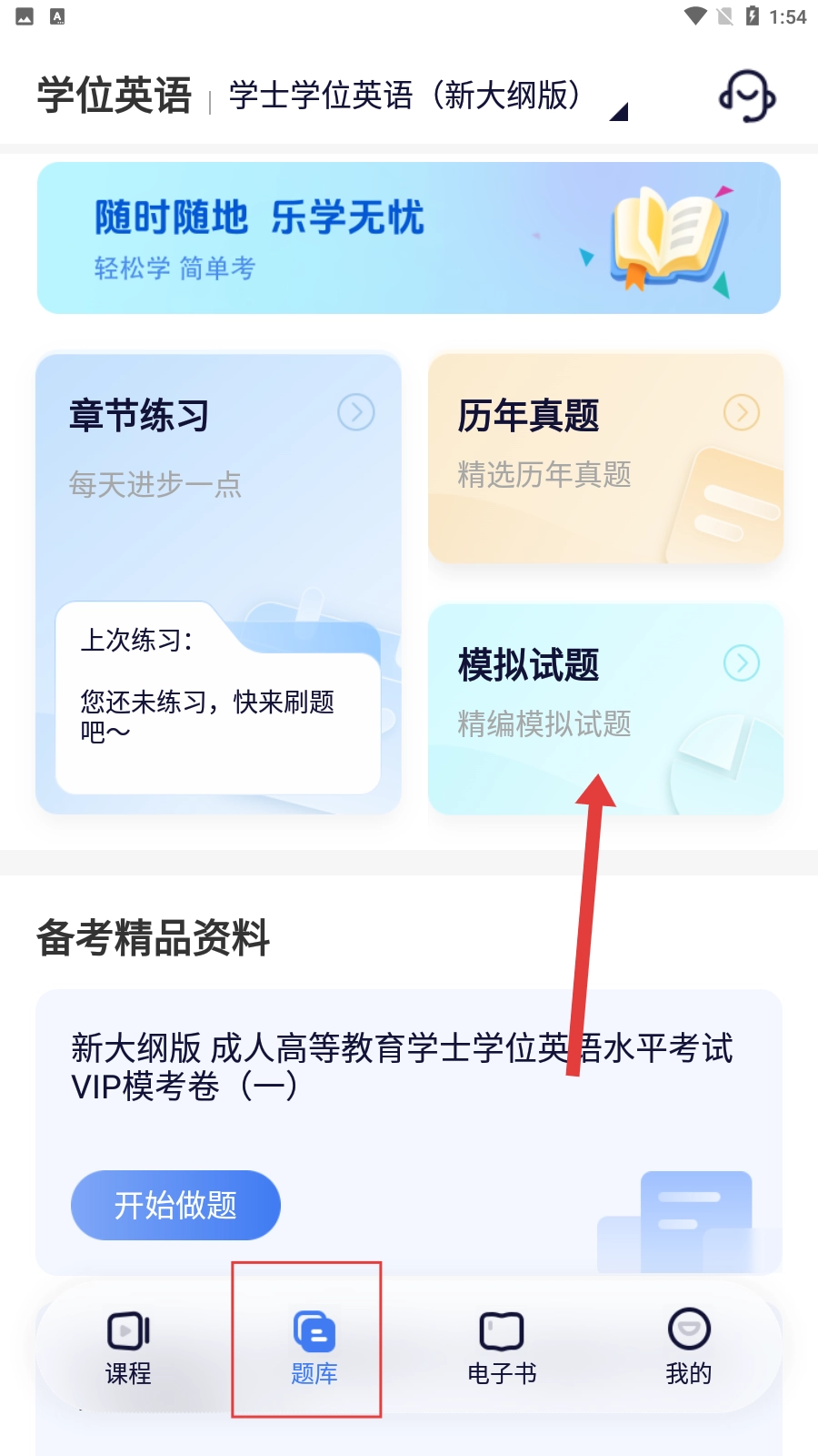 3、在学位英语页面,点击底部【题库-按钮】,选择【模拟试题-板块】。
