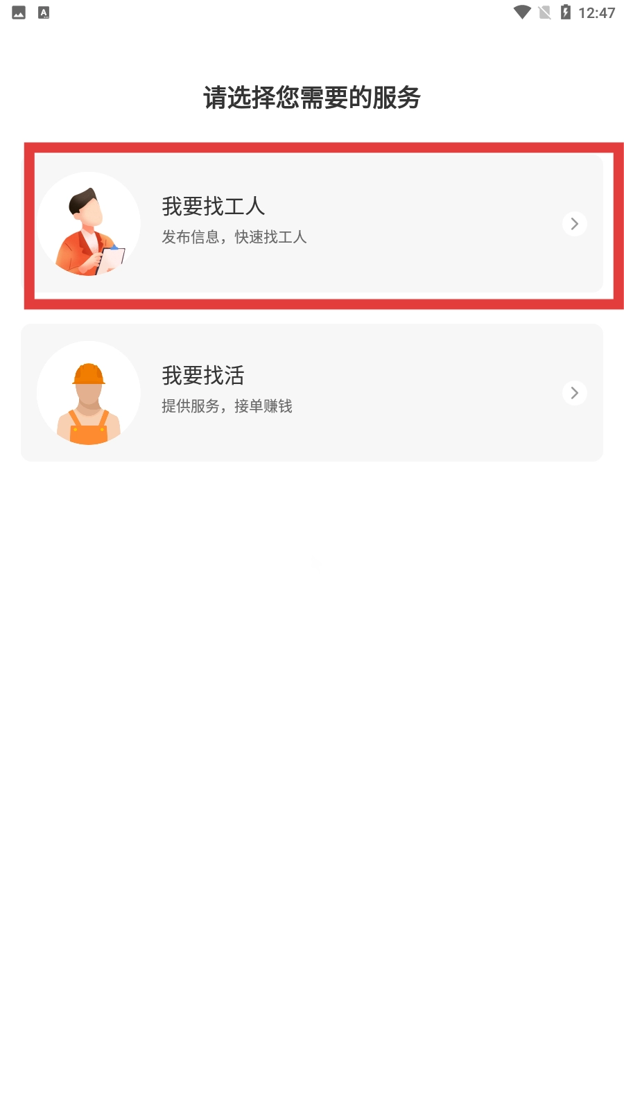 1、选择【我要找工人-服务选项】,进入找工人页面。