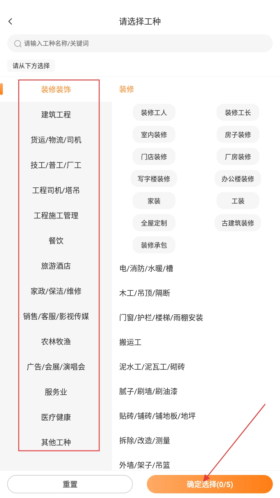 3、在工种选择页面,选择所属行业及具体工种后,点击“确定选择”。