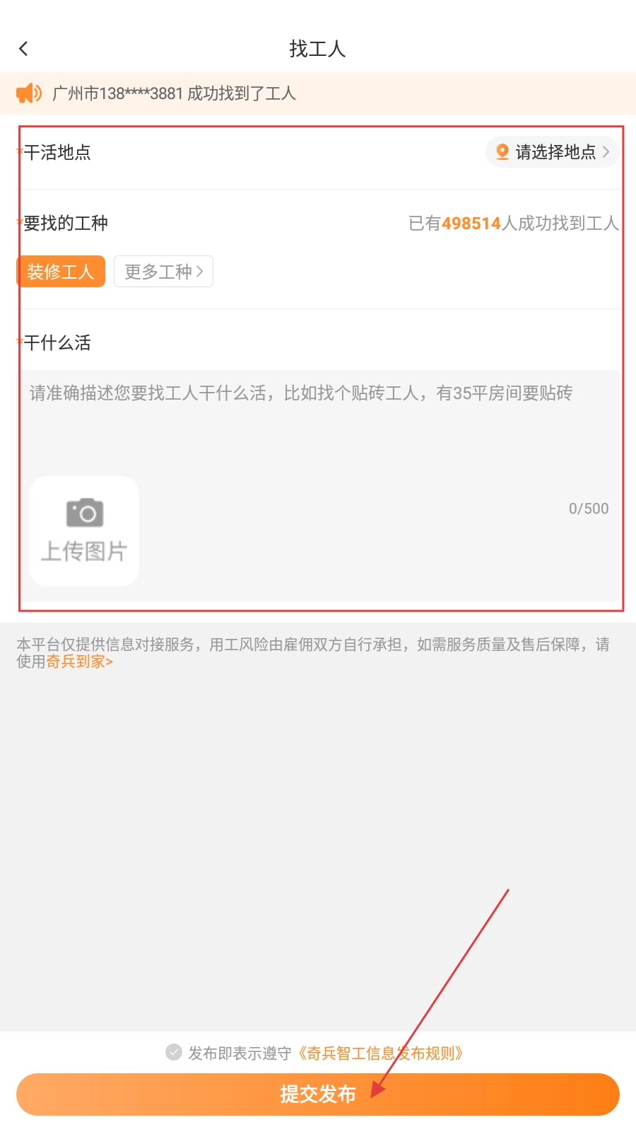 4、在找工人发布页面,填写干活地点、工种及工作内容后,点击“提交发布”。