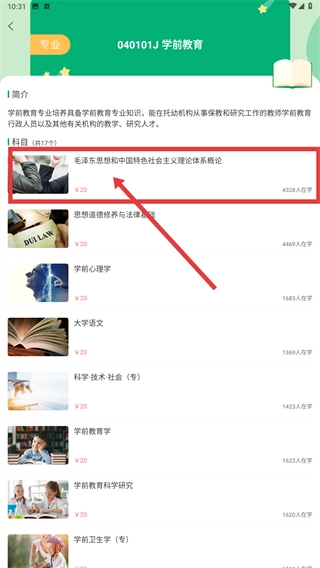 3、在学前教育专业的科目列表里,找到并点击《毛泽东思想和中国特色社会主义理论体系概论》这一科目,即可进入该科目的学习资源页面。