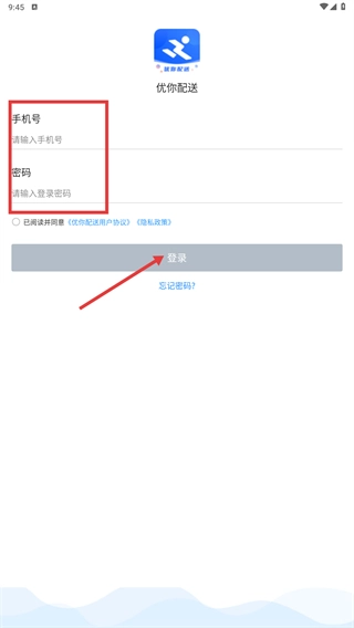1、打开优你配送应用,点击【同意】按钮以确认接受《隐私政策》和《用户协议》,随后即可开启应用体验。